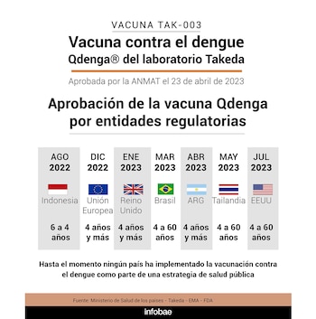 La vacuna tetravalente contra el dengue del laboratorio japonés Takeda (TAK-003), conocida como Qdenga, fue aprobada hace un año en Argentina por la Administración Nacional de Medicamentos, Alimentos y Tecnología Médica (ANMAT). Y ya había recibido la luz verde por la Agencia Europea de Medicamentos (EMA) y los entes regulatorios de Indonesia, Reino Unido, Islandia, Noruega y Brasil, entre otros países que luchan contra esta enfermedad.