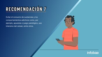 Tratar de evitar el consumo de sustancias y los comportamientos adictivos como, por ejemplo, apuestas o juego patológico, uso intensivo del celular, entre otros. Estos se encuentran relacionados con la depresión por el impacto psicosocial que producen, por su efecto en el cerebro, desensibilizando el circuito de recompensas y generando anhedonia (falta de placer). También se vinculan con la depresión por los síntomas de abstinencia cuando se intenta disminuir el consumo y por cómo estas sustancias interactúan con los genes.