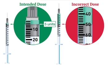 A los pacientes se les dijo que extrajeran una dosis de 5 unidades, destinada a ser de 0,05 ml. Usando las marcas de la jeringa, extrajeron por error una dosis de 50 unidades de 0.5 ml, dijo la FDA.