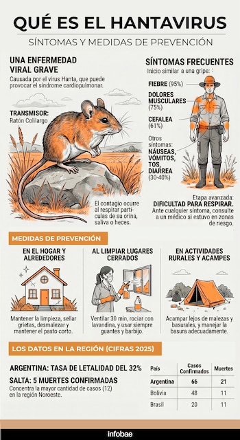 Durante 2025, se notificaron 72 casos confirmados y 22 personas fallecidas por hantavirus en Argentina, lo que equivale a una letalidad del 29,2%.