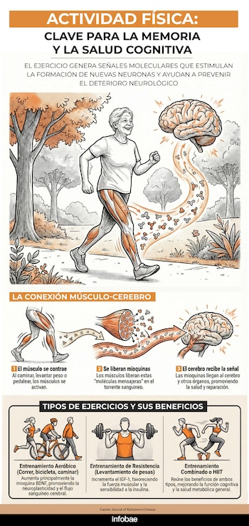 Y añadió: “Estudios recientes indican que la actividad física sostenida puede retrasar alteraciones relacionadas con el Alzheimer y el Parkinson mediante la acción de las mioquinas”.