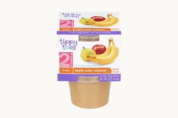 Producto: Puré de fruta Tippy Toes Manzana Pera y Plátano Embalaje: cajas de plástico de dos con funda exterior Número de lote: 07174 Fecha de caducidad: 17 de julio de 2026 Código de paquete: INIA0120 UPCs: 036800 y 265783