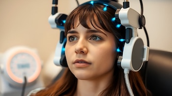 La TMS aplica pulsos magnéticos para estimular áreas específicas del cerebro mediante electrodos colocados en el cuero cabelludo del paciente.
