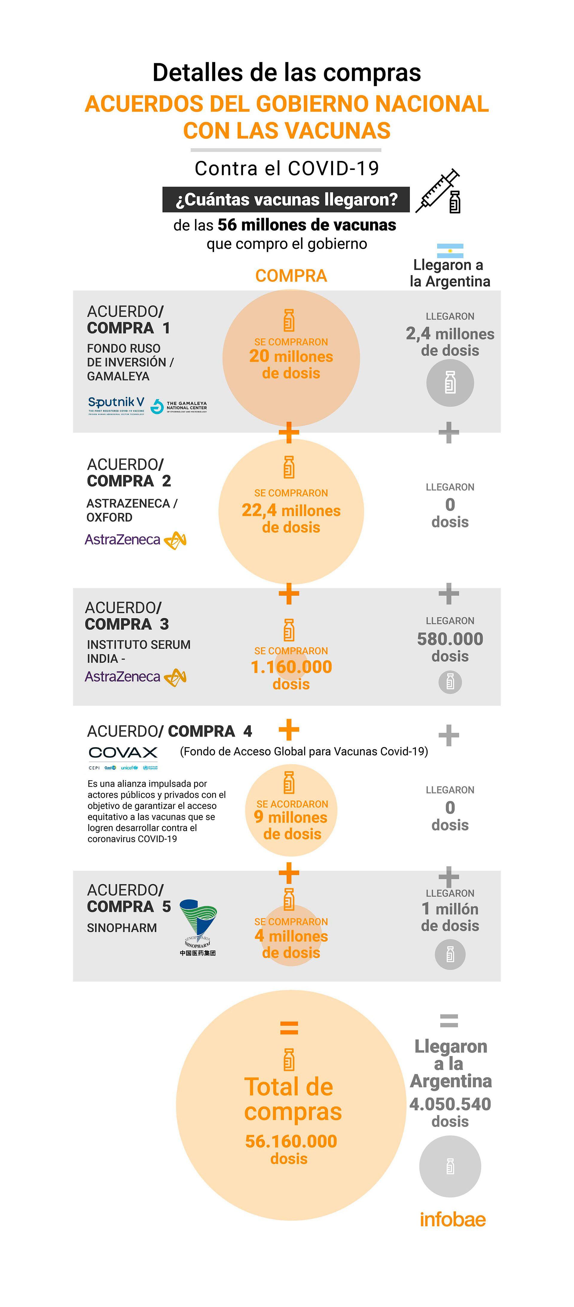 Por esta operación -22.429.842 millones de dosis totales- Argentina pagó anticipadamente 92 millones de dólares, aunque todavía el país no recibió ninguna vacuna de este contrato. Solo arribaron al país poco más de 1 millón de dosis de AstraZeneca a través del mecanismo COVAX (fondo codirigido por la Alianza Gavi para las Vacunas, la Coalición para la Promoción de Innovaciones en pro de la Preparación ante Epidemias y la Organización Mundial de la Salud, con el objetivo es acelerar el desarrollo y la fabricación de vacunas contra el COVID-19 y garantizar un acceso justo y equitativo a ellas para todos los países), habiéndose incorporado estas al sistema nacional de vacunación.