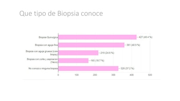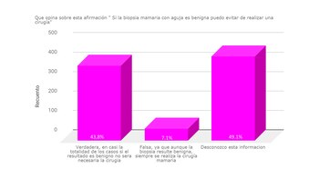 Una biopsia mamaria con aguja puede evitar una cirugía: Esta afirmación es verdadera para aquellos casos en los que el resultado de la biopsia mamaria con aguja es benigno. Las biopsias mamarias con aguja han logrado disminuir el número de cirugías mamarias innecesarias. El 49% de las mujeres encuestadas desconocen esta información.