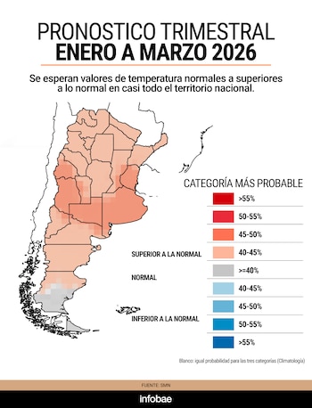Las proyecciones del Servicio Meteorológico Nacional para enero, febrero y marzo de 2026 anticipan que Cuyo, La Pampa, Buenos Aires y el sur del Litoral tienen una alta probabilidad de registrar temperaturas medias por encima del rango habitual. El informe señala que en el norte argentino, el oeste de Santa Fe, Córdoba y sectores de la Patagonia, los valores térmicos podrían ubicarse entre el promedio histórico y el umbral superior.