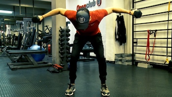 El primero de los ejercicios posturales se realiza en posición angular. Trabaja un amplio abanico de músculos: deltoides trasero, trapecio medio y superior, infraespinoso, romboide, tríceps braquial, extensores de la muñeca, glúteos, aductores y lumbar. Son tres series de 12 repeticiones.