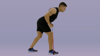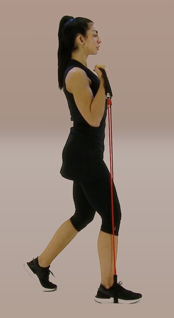 Partiendo de una postura ligeramente inclinada es apropiado sostener la espalda recta y los hombros alineados. Los extremos de la banda elástica deben dirigirse hacia la cadera, elevando la punta del codo.