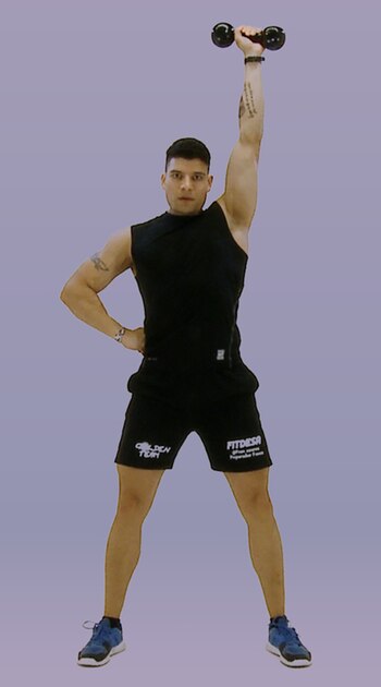 En este caso se empieza con un movimiento clásico de biceps, llevando las mancuernas hasta el pecho. Luego, al levantar, los brazos giran hasta que quedan completamente extendidos por sobre la cabeza y con las palmas mirando hacia el frente.