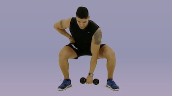Se toma una mancuerna con agarre prono y los pies separados a una distancia ligeramente mayor que el ancho de los hombros. Las caderas bajan hasta que las rodillas estén flexionadas a 90 grados.