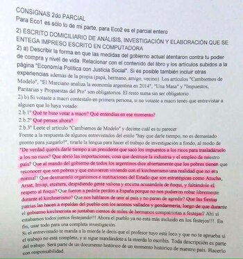 Las consignas pedían "describir la forma en que las medidas del gobierno actual atentaron contra tu poder de compra y nivel de vida" y exigía que los alumnos lo relacionaran con artículos de autoría del docente, con títulos del tipo "Cambiemos de modelo" o "Una masa".