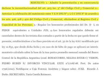 Según publica el sitio Tiempo de Justicia, en la resolución el juez de familia de los tribunales provinciales de Rosario, Ricardo Dutto, declaró inconstitucional el artículo 403 del Código Civil y Comercial que hace referencia a los impedimentos para contraer matrimonio entre ambas y habilitó la unión.
