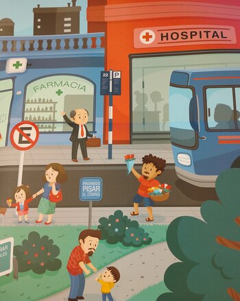 —Claro, primero el marco, el manual. Yo un manual lo concibo como un punto de partida, no de llegada. Porque si usted concibe un manual como un punto de llegada ahí se cerró el conocimiento. No, este libro es un trampolín, a partir de aquí comienza uno a elevarse. Y va acompañado de una carpeta de láminas propias para el inicial, que van mostrando realidades que hay que reconocer, por ejemplo muestran una esquina donde hay gente cruzando con luz roja, otro que tira el papel fuera…, el chico los va viendo y reconociendo, está comprendiendo el mensaje, la forma del saludo, del despido. Bueno, todo esto es para trabajar en la salita. El segundo nivel es un conjunto de cuadernillos de 1° a 7°, con una serie de ejercicios y de sugerencias didácticas, que elabora el equipo; yo los apruebo, los retoco. Así ha salido un pack, como dicen ahora, que me parece muy conveniente porque está cubriendo por lo menos 2 niveles, inicial y primaria. Faltaría el tercer nivel para el cual estoy preparando material para la educación basada en casos.