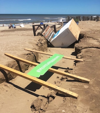 La tormenta fue impiadosa en la playa. Y destrozó todo lo que se encontró en su camino. En la playa a la altura de Bunge levantó la base de la construcción donde funciona la histórica radio de Juan Alberto Badía. Tiró los andamios, socavó la arena y dejó una canaleta de un metro de profundidad. Allí se empezó la reconstrucción pero según admitieron en el Municipio llevará dos o tres días de trabajo.