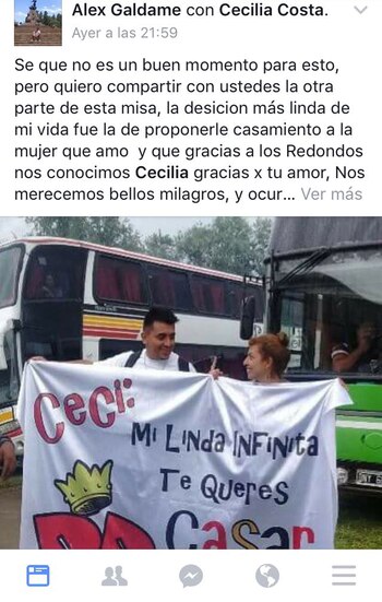 El segundo romántico fue Alex Galdame, que escribió en una bandera junto al inconfundible logo de Patricio Rey y sus Redonditos de Ricota: "Mi linda infinita te querés casar conmigo?".
