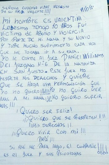"Yo no quiero ver más a mi mamá. No quiero sufrir más". Estas conmovedoras palabras fueron escritas en una carta por Valentina Ledesma, una nena de tan solo diez años que vive con su padre en La Matanza, donde relata los maltratos que sufre por parte de su madre cada vez que debe ir a visitarla por la determinación de un juez que prioriza la "revinculación".
