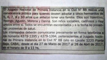 Si ser "grande" deja afuera a muchos chicos del derecho a tener una familia, formar parte de un grupo de hermanos vuelve a reducir sus chances. En marzo, la Justicia porteña hizo una convocatoria pública para adoptar a un grupo de cinco hermanos de entre 5 y 10 años, sanos y escolarizados. No quisieron separarlos porque el nuevo Código Civil también prioriza la "preservación de los vínculos fraternos": no encontraron ninguna familia para ellos.