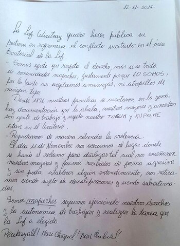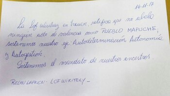 "La Lof Wiritrray quiere hacer pública su postura en referencia al conflicto suscitado en el área territorial de la Lof. Somos gente que respeta el derecho, más si se trata de comunidades mapuches, justamente porque LO SOMOS, por lo tanto no aceptamos amenazas ni atropellos de ningún tipo", indicó la comunidad en la carta.