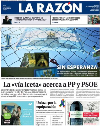 "Sin esperanza", tituló La Razón, de Madrid. "Las familias dan por muertos a los tripulantes del submarino argentino ARA San Juan y abren una crisis de Gobierno: 'lo sabían todo y no dijeron nada, desgraciados'", resumieron.