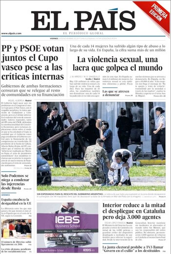 Para el centro de su tapa, El País eligió una de las tantas fotos que dejó la jornada de ayer en Mar del Plata. "Sin esperanzas para el rescate del submarino argentino. La noticia de que hubo una explosión en la zona donde desapareció el sumergible con 44 tripulantes llenó ayer de desolación la base de la Armada en Mar del Plata", se lee debajo de la imagen.