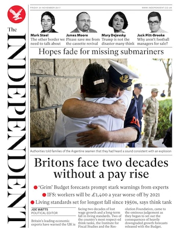 "Se desvanece la esperanza para los submarinistas desaparecidos", dijo The Independent. "Las autoridades comunicaron a las familias de los marinos que detectaron un sonido consistente con una explosión", añadieron al pie de la foto.
