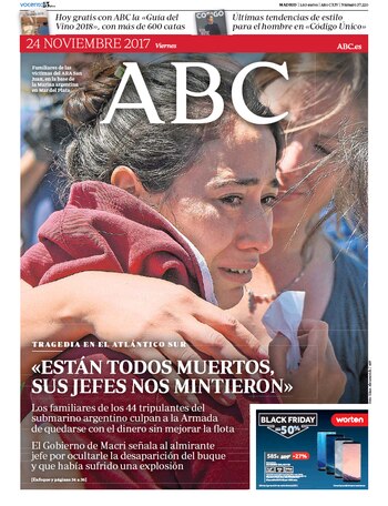 "Están todos muertos, sus jefes nos mintieron", es la textual que destaca el ABC en su portada. "Los familiares de los 44 tripulantes del submarino argentino culpan a la Armada de quedarse con el dinero sin mejorar la flota. El Gobierno de Macri señala al almirante jefe por ocultarle la desaparición del buque y que había sufrido una explosión", dice la bajada.