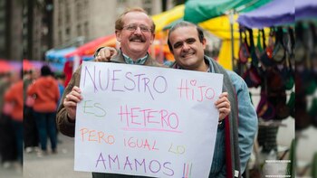 De él habla el cartel que trajeron sus padres el sábado, cuando viajaron a Buenos Aires a participar de la marcha del Orgullo LGBTIQ (Lesbianas, Gays, Bisexuales, Transexuales, Intersexuales y Queer. "Nuestro hijo es hétero pero igual lo amamos", dice. "Fue una ironía simpática -explica Rubén-. Quisimos parafrasear el discurso que dice: 'Nuestro hijo es gay pero igual lo amamos', como si no quedara más remedio. La idea era no sólo mostrar lo bizarro de nuestra comunidad sino abrir el diálogo, poder hablar de nuestras familias".