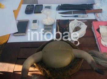 Además, los efectivos decomisaron otros elementos, como una gomera para tirar piedras utilizada por los "soldados" que vigilaban en la entrada o desde la terraza, tres cuchillos de gran tamaño y, como no podía faltar, un casco tipo vikingo.