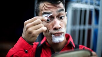 El primero que se acerca a hablar con Infobae es Pedro Terra, a medio transformarse en "Pepo", el presentador de La Audacia. Habla cruzado, gesticula en el aire, los bigotes en espiral, el moño colgándole de la solapa y la camisa todavía desabotonada, dice a todo que "Sí, sí, sí", usa la palabra "magnífico" acerca de conocer la historia del circo y después desaparece. "Hablen con Marote", aclanza a entendérsele mientras se va, sin dar nunca a conocer de quién está hablando.