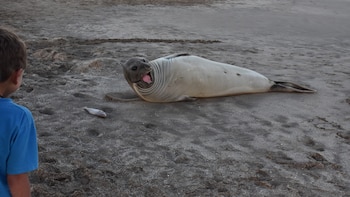 En la madrugada del martes, un elefante marino apareció tendido en la playa de Valeria del Mar y sorprendió a todos los turistas.