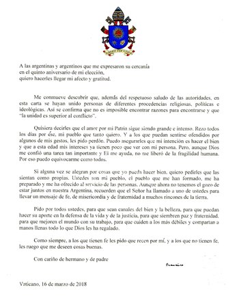Con una carta dirigida a "las argentinas y argentinos", el papa Francisco agradeció a quienes le expresaron "su cercanía" en el quinto aniversario de su entronización como sumo pontífice, dijo que su amor por la Argentina sigue siendo "grande e intenso" y pidió perdón "a los que puedan sentirse ofendidos por algunos de mis gestos".
