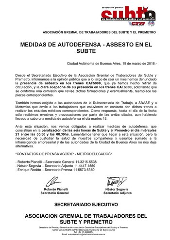 Según precisa un comunicado difundido por Agtsyp, la medida de fuerza fue tomada "ante la intransigencia de Subterráneos de Buenos Aires (Sbase), el Gobierno de la Ciudad y la actual operadora, Metrovías, para inspeccionar los trenes CAF6000 sospechados de contener "asbesto".