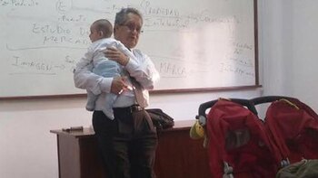 Aquel día, primero fue la beba la que se puso inquieta y empezó a llorar, por lo que la ayudante de cátedra decidió tomar la posta: la alzó y se la llevó afuera del aula para darle una mamadera.