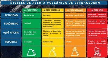 El alerta naranja significa "una erupción mayor probable en los próximos días o semanas", explicó Vicente Godoy, intendente de la localidad neuquina Las Ovejas, quien además comunicó ante la prensa local que esa zona junto con Varvarco, Manzano Amargo (la más cercana, a 57 kilómetros), Andacollo y Los Miches estarían afectadas por las cenizas.