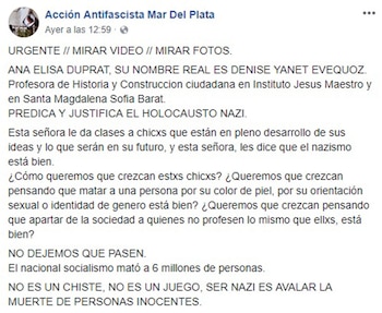 "A Hitler lo demonizaron, pero no fue tan así", resume la profesora de Historia y Construcción Ciudadana en el Instituto Jesús Maestro y en Santa Magdalena Sofía Barat, en Mar del Plata. Su nombre es Denise Yanet Evequoz, aunque en las redes sociales se hace llamar "Ana Elisa Duprat".