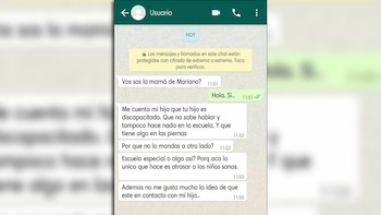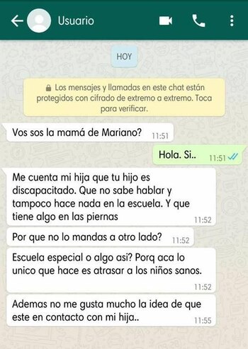 En el chat la mujer primero le pregunta si está hablando con la madre de Mariano. Ante la respuesta afirmativa, le comentó: "Me di cuenta de que tu hijo es discapacitado. Que no sabe hablar y tampoco hace nada en la escuela. Y que tiene algo en las piernas".
