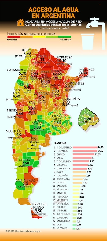 "El objetivo de recolectar la información es hacer un aporte a la gestión hídrica integrada, es decir abarcar agua y saneamiento", agregó la experta que recorrió junto al equipo varios puntos del país para poder corroborar cifras y experiencias. Los resultados, que se obtuvieron utilizando los datos del Censo 2010, de las EPH y de las visitas de campo, son alarmantes en algunos territorios. Santiago del Estero, Formosa, Chaco, Salta y Tierra del Fuego figuran primeras en el ranking si se analiza la falta de acceso al agua de red. Con el orden apenas cambiado, aparecen los mismos distritos sin acceso a cloacas: Chaco, Formosa, Salta y Tierra del Fuego.