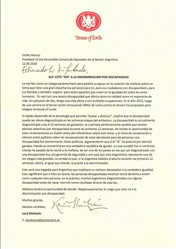 Shinkwin se ha convertido en activo defensor y promotor de los derechos de las personas con discapacidad, y es en esa condición que le ha escrito una carta a Emilio Monzó, presidente de la Cámara de Diputados, para llegar por su intermedio con un mensaje a todos los legisladores que mañana deben votar el proyecto de ley que despenaliza el aborto en nuestro país.