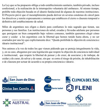 "Las instituciones de salud, creadas y llevadas adelante por personas que persiguen un bien compartido bajo valores comunes, también queremos elegir cómo curar y cuidar a los argentinos con la libertad que hemos tenido hasta ahora y no ser coartados por ley que explícitamente dice: "Queda prohibida la objeción de conciencia e ideario institucional"", indicaron las instituciones firmantes.