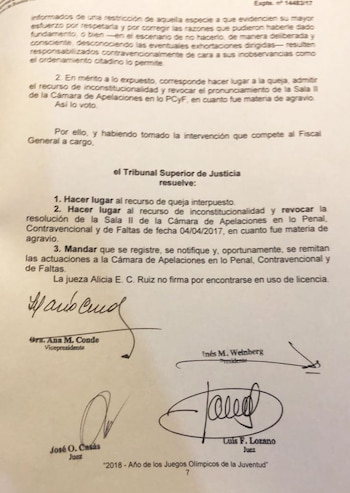 En un fallo unánime firmado por los jueces Inés Weinberg (presidente), Ana María Conde, José Casás y Luis Lozano, el máximo tribunal porteño sostuvo que un bloqueo como el dictado "lesionaría innecesaria y desproporcionadamente derechos (…) tales como: el acceso e intercambio de información; la obtención de conocimientos y transmisión de ellos mediante la utilización de contenidos, herramientas y de aplicaciones; y la posibilidad de cualquier usuario de esa red global (internet) de comunicarse o desenvolverse libremente en ella" y que "pone en riesgo el derecho humano a las comunicaciones" a través de internet (…) y el principio de la "completa neutralidad de las redes" que "se encuentra asegurado por nuestro ordenamiento jurídico".
