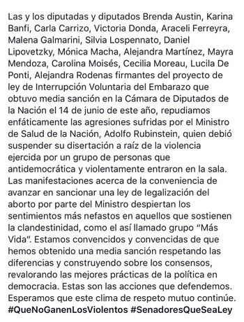 "Estamos convencidos y convencidas de que hemos obtenido una media sanción respetando las diferencias y construyendo sobre los consensos. Esperamos que este clima de respeto mutuo continúe", cierra el comunicado.