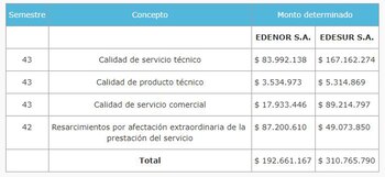 Por calidad de servicio técnico, de producto técnico y de servicio comercial, Edesur S.A. deberá resarcir con una suma exacta de $261.691.940, sumados a los $49.073.850 por resarcimientos por afectación extraordinaria de la