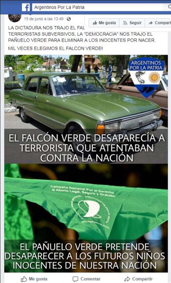 En una de ellas se ve la imagen de un Ford Falcon verde -característico de los grupos de tareas en la última dictadura militar- con la leyenda "El Falcon verde desaparecía a terroristas que atentaban contra la Nación. El pañuelo verde pretende desaparecer a los futuros niños inocentes de nuestra Nación". Y en la publicación escribieron: "Mil veces elegimos el Falcon verde".