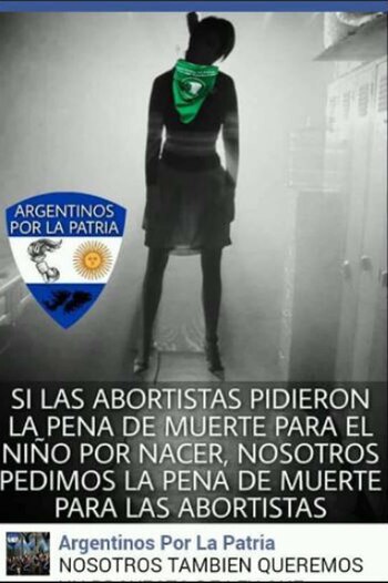 En una de las imágenes subidas al "muro" de esta páginas se veía la imagen de una mujer ahorcada con un pañuelo verde como el de la Campaña Nacional por el Aborto Legal, Seguro y Gratuito en su cuello. En la publicación, además, se leía: "Si las abortistas pidieron la pena de muerte para el niño por nacer, nosotros pedimos pena de muerte para las abortistas".