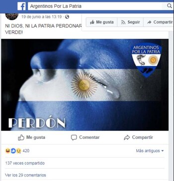 Un grupo de dirigentes de la Central de Trabajadores de la Argentina (CTA) denunció por apología del delito a una página de Facebook con el nombre "Argentinos por la Patria" donde se publicaron frases e imágenes amenazantes a partir de la media sanción en el Congreso de la Nación del Proyecto de Ley de Interrupción Voluntaria del Embarazo.
