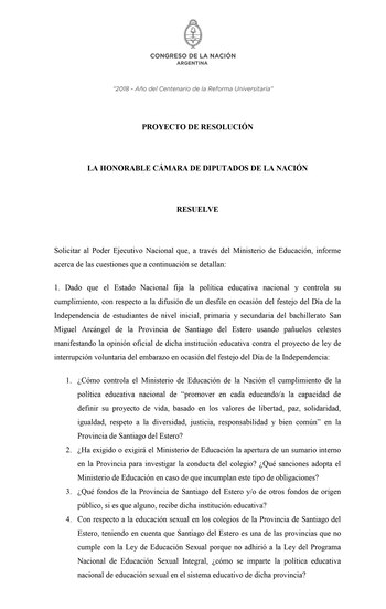 Ponemos a consideración de nuestros pares este pedido de informes ante la preocupación por la difusión de imágenes audiovisuales de los festejos del 9 de Julio, Día de la Independencia, en la Escuela San Miguel Arcángel de Santiago del Estero, donde alumnos y alumnas de jardín de infantes, primaria y secundaria, habrían sido obligados a marchar como militares llevando pañuelos celestes, en alusión a la postura oficial de dicha institución educativa contraria al proyecto de interrupción voluntaria del embarazo, actualmente en tratamiento en el Senado de la Nación de Argentina.