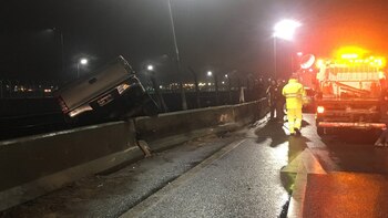 La imagen del accidente generó estupor: la camioneta gris terminó con una abolladura muy pronunciada en su lateral derecho y volcada al otro lado del guardarrail, a muy pocos metros de las vías de tren de la línea Belgrano Norte.