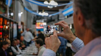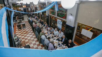 El clima festivo invade una mesa interminable. Es tan larga que ocupa casi todo el salón de la pizzería Santa Mónica, a pasos del Congreso. Cada año la atiende con esmero el mismo mozo: Rubén Ruiz. Las banderas argentinas se entrelazan en el techo como si fueran guirnaldas y entre pizzas, vino, cerveza y fainá sobrevuela un conmovedor espíritu de camaradería.