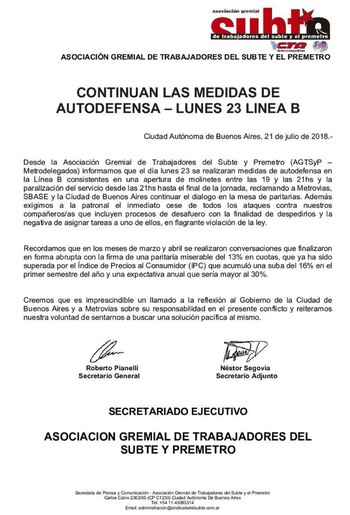 A través de un comunicado, el gremio consideró que "es imprescindible un llamado a la reflexión al Gobierno de la Ciudad de Buenos Aires y a Metrovías sobre su responsabilidad en el presente conflicto".