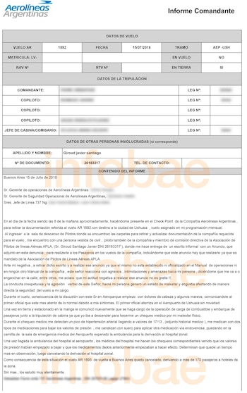 En pleno desarrollo de esta peculiar campaña, el 17 de julio pasado, el Capitán Sebastián Fabre se disponía a realizar los trámites previos en la oficina de pre embarque del aeroparque metropolitano en su carácter de Comandante del vuelo AR 1892 con destino a Ushuaia, cuando el delegado gremial Santiago Giraud le solicitó que una vez en vuelo proceda a la lectura del comunicado gremial.